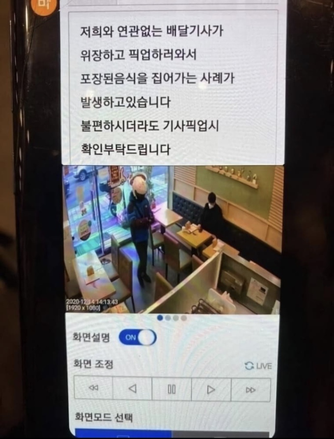 글 속에는 신종 사기 수법을 경고하는 문자 메시지 사진이 첨부돼 있는데, 문자에는 “저희와는 연관없는 배달기사가 위장하고 픽업하러 와서 포장된 음식을 집어가는 사례가 발생하고 있다”며 “불편하시더라도 기사 픽업 시 확인 부탁드린다”고 적혀 있다.