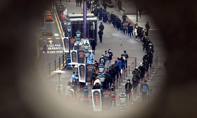 선별검사소 앞 길게 늘어선 줄 23일 서울 중구 ‘서울로7017’의 환풍구 너머로 찍은 서울역 임시 선별검사소 앞 풍경. 코로나19 검사를 받기 위해 많은 시민이 줄 서 있는 모습이다. 이날 0시 기준 국내 코로나19 신규 확진자는 1092명으로, 3일 만에 다시 1000명대에 진입했다. 남제현 선임기자