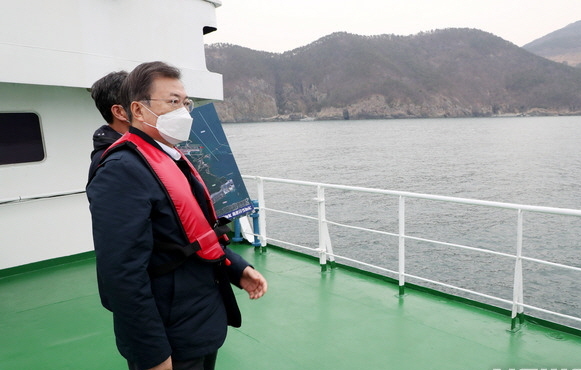 문재인 대통령이 지난 2월 25일 부산에서 열린 ‘동남권 메가시티 구축 전략 보고’에 참석, 가덕도 공항 예정지를 선상 시찰하고 있다. 부산=뉴시스