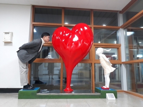 현관 한쪽에는 빨간색의 큰 하트와 귀여운 소녀가 입을 맞추는 듯한 조형물이 자리를 잡고 있다. 학생들은 이곳에서 소녀 조형물과 비슷한 자세로 사진을 찍기도 한다.