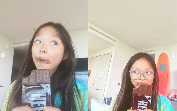 공개된 사진 속에서 추사랑은 자신의 얼굴 크기 만한 초콜릿을 한입 베어 물고 베시시 웃음 짓고 있다. 쨍한 색감의 안경이 ‘장꾸미’를 더해줘 귀여움을 자아낸다.