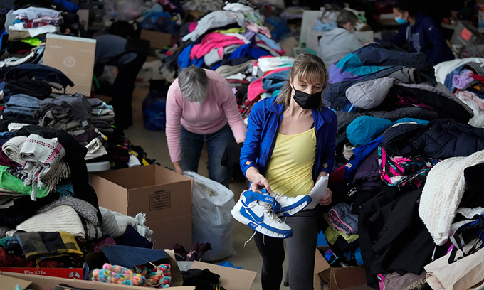 우크라이나 피란민들에게 보낼 구호물품을 모아둔 캐나다 오타와의 한 성당 모습을 전한 지난 5일의 외신 사진 중 하나다. 한 화면에 잡히진 않았지만 의류 말고는 아기용품, 의료품 등 수많은 사람들이 보내준 각종 물품들로 성당은 가득 찼다.