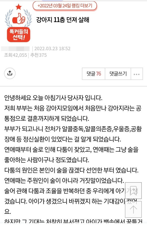 지난 23일 온라인커뮤니티 '네이트판'에는 해당 사건의 남편이라고 밝힌 A씨가 '강아지 11층 던져 살해'라는 제목의 글을 게재했다. 이 글은 25일 낮 12시 현재 조회수 4만2250회를 기록하는 등 누리꾼들의 관심을 끌고 있다.