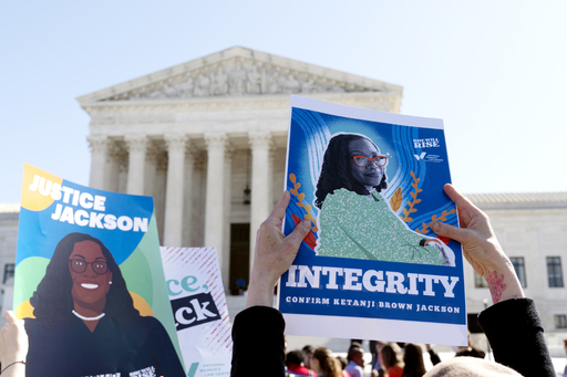 지난 21일(현지시간) 워싱턴 연방대법원 앞에서 커탄지 브라운 잭슨(51) 대법관 후보자 인준을 지지하는 집회가 열리고 있다. 한 참가자가 대법관 자질 중 하나인 ‘고결성’(integrity)이란 문구가 적힌 팻말을 들고 있다. 잭슨 지명자가 상원 인준을 통과하면 미국 대법원 233년 역사상 최초의 흑인 여성 대법관이 된다.