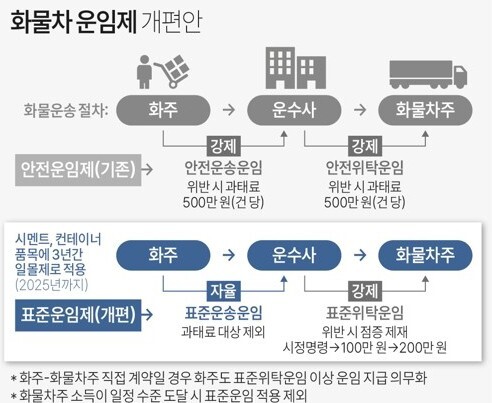 새로 도입하는 표준운임제는 운송사가 화물차 기사에게 주는 운임은 강제하되, 화주와 운송사 간 운임에는 강제성을 두지 않고 매년 가이드라인으로 제시한다. 화주에 대한 처벌 조항을 없앤 게 핵심이다.