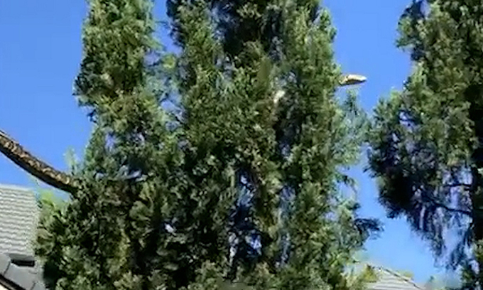 얼룩뱀은 주택 지붕에서 꼬리를 떼고 정원의 침엽수로 이동하던 중 한때 아래쪽 구경꾼들에게 머리를 쑥 내밀었다.