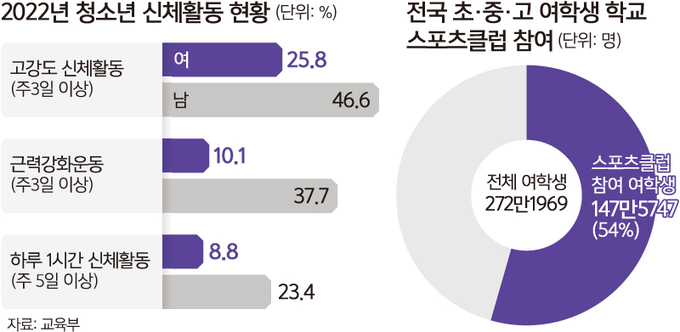 ‘골 때리는 그녀들’, ‘사이렌’ 등 운동하는 여성들이 미디어 전면에 등장하며 2030세대 여성들 사이에서 운동 열풍이 불고있다. 반면 지난해 전국 초·중·고 여학생 중 교내 스포츠클럽 참여 인원이 절반에 그치는 등 여학생의 ‘운동장 소외’ 현상은 여전한 것으로 나타났다. 2016년 교육부와 각 학교장이 여학생 체육활동 활성화 방안을 의무적으로 수립·시행하도록 체육활동진흥법을 개정한 이후 7년의 성과로는 아쉬움이 크다는 지적이 나온다.