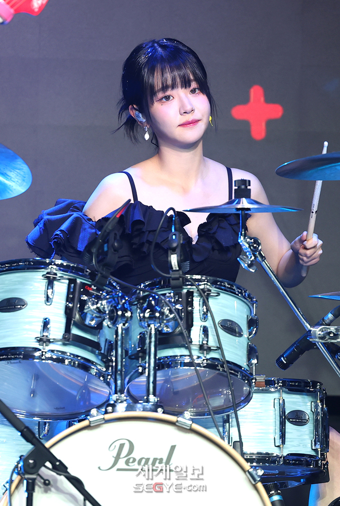 밴드 QWER 쵸단이 18일 오후 서울 서교동 무신사 개러지에서 진행된 데뷔 싱글 1집 '하모니 프롬 디스코드(Harmony from Discord)' 쇼케이스에 참석해 열띤 공연을 펼치고 있다.