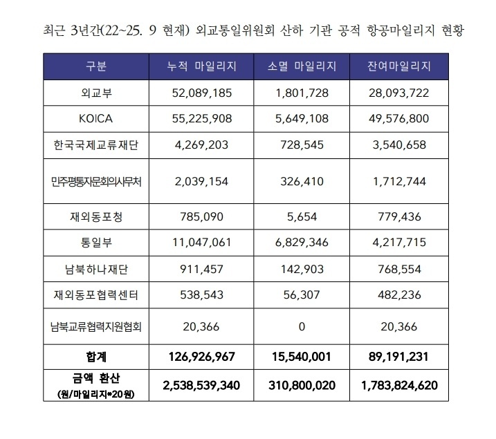 현재 각 기관 계정에는 8919만1231 마일리지(약 17억8000만원)가 남아있다. 기관별로는 코이카 4957만6800 마일리지(약 9억9000만원), 외교부 2809만3722 마일리지(약 5억6000만원), 통일부 421만7715 마일리지(약 8000만원) 순으로 많았다.
