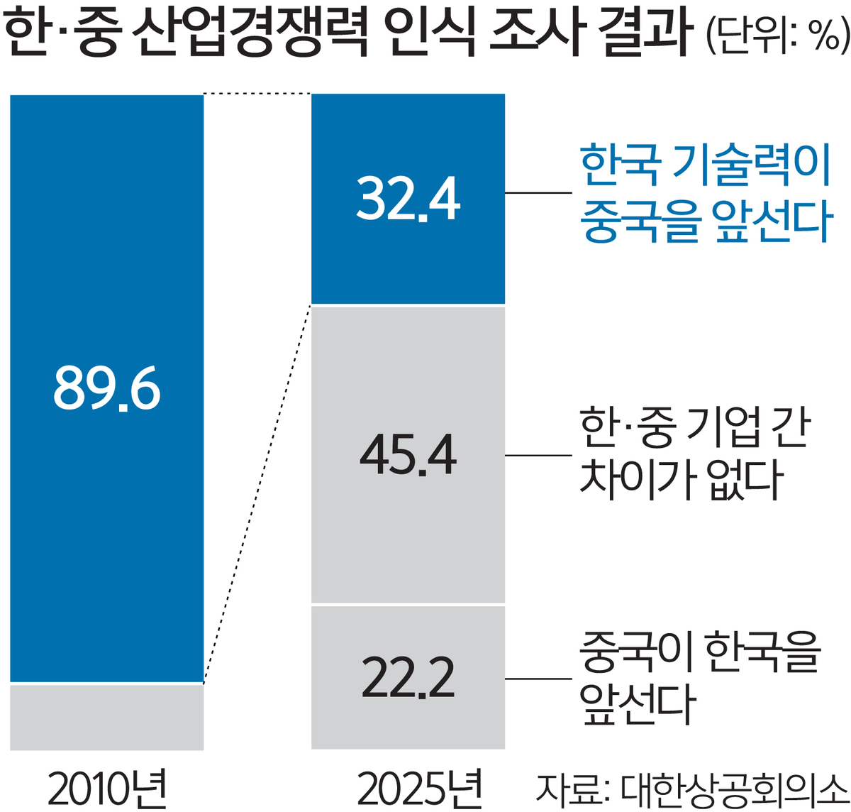 21일 발표된 대한상공회의소의 ‘한·중 산업경쟁력 인식 조사’ 결과에 따르면 한국의 기술력이 중국을 앞선다고 답한 기업은 32.4%에 그쳤다. 2010년 같은 조사 때(89.6%)와 비교하면 15년 만에 57%포인트 급감했다. 그만큼 한국 제조기업의 자신감이 낮아진 것이다. 조사는 최근 국내 제조기업 370개사를 대상으로 이뤄졌다.
