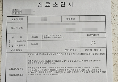 서씨는 "입사 당시 건강에 아무런 문제가 없었던 남편은 입사 이후 간 수치가 서서히 올라가기 시작했다"며 "2023년 10월 열이 심하게 나 병원에 갔다가 백혈구 수치가 높아 골수검사를 했고, 이후 급성골수성백혈병이라는 진단을 받았다"고 말했다.
