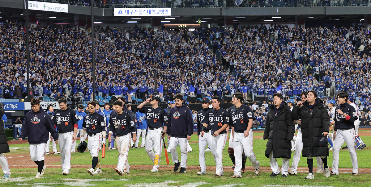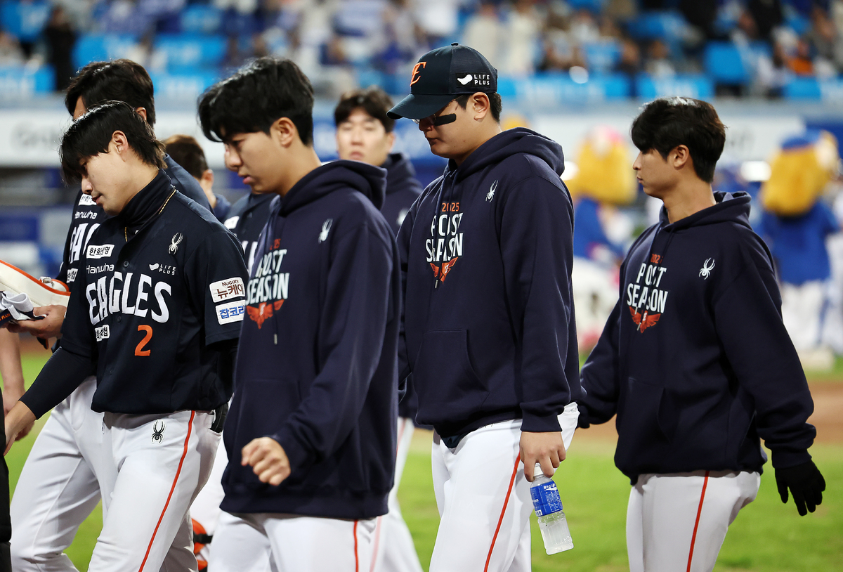 22일 대구삼성라이온즈파크에서 열린 2025 KBO 포스트시즌 플레이오프 한화 이글스 대 삼성 라이온즈 4차전. 7 대 4 삼성의 승리로 경기가 끝난 후 한화 김서현을 비롯한 선수들이 무거운 표정으로 경기장을 나서고 있다. 연합뉴스