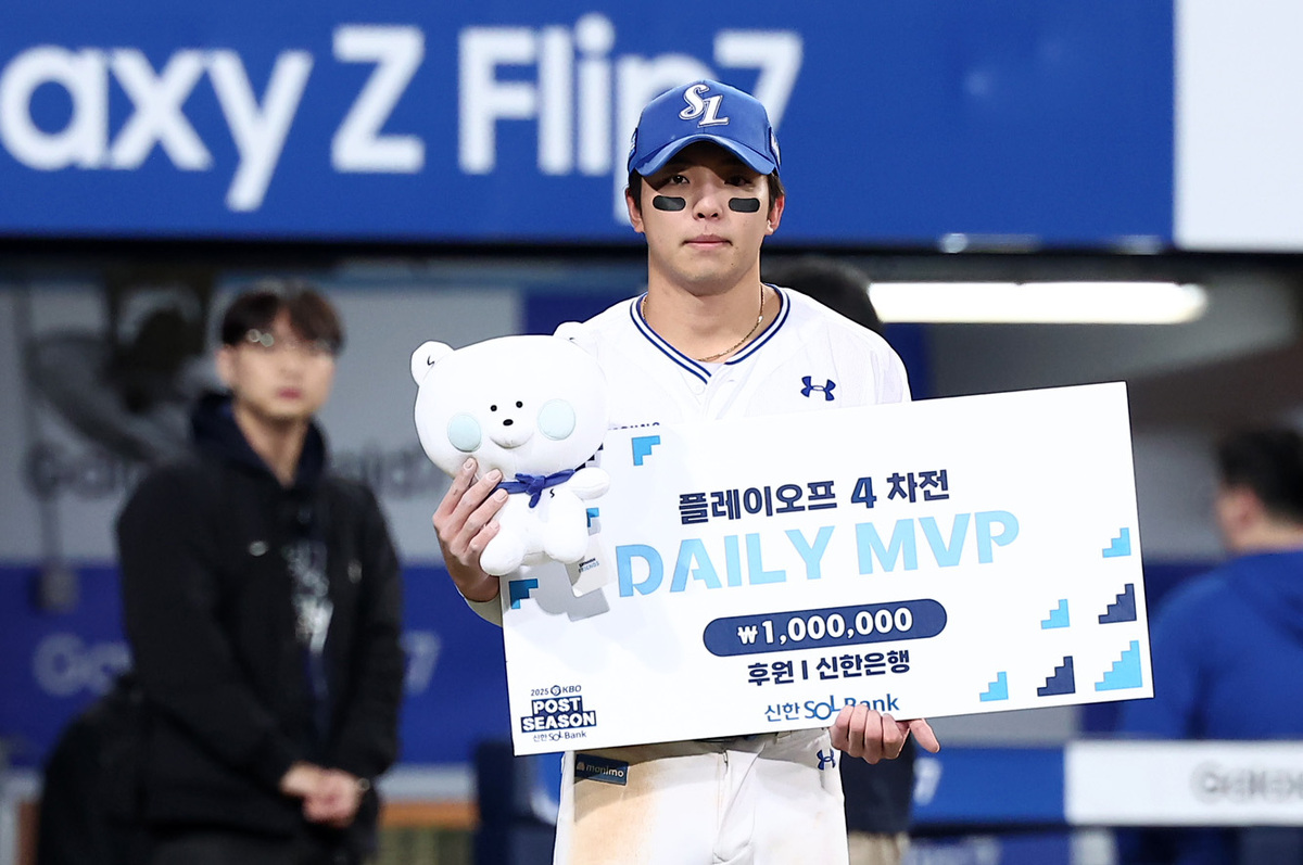 삼성 김영웅이 데일리MVP에 선정된 후 기념촬영을 하고 있다. 뉴스1