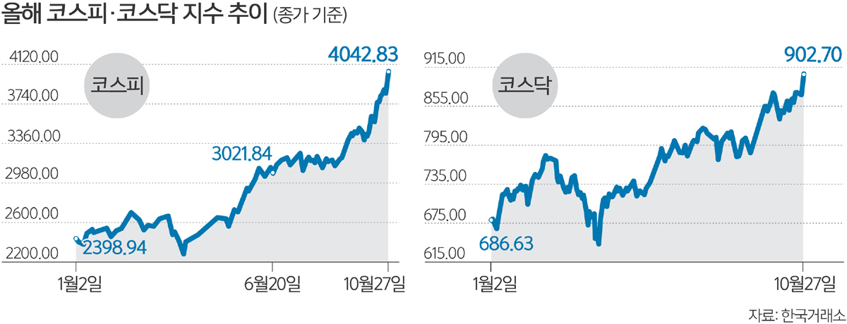 코스피가 27일 전인미답의 4000선에 올라서면서 꿈의 지수인 ‘오천피’(코스피 5000) 여정이 본격화했다는 평가가 나온다. 올해 2200선까지 후퇴했던 코스피는 대형 기술주가 상승 흐름을 주도하며 지수를 끌어올렸다. 인공지능(AI) 수요 확대에 힘입어 반도체 종목을 중심으로 랠리가 이어졌고 정책 지원과 글로벌 유동성이 확대된 환경이 수급을 뒷받침했다. 무역갈등과 관세협상 등 대외 변수가 여전한 만큼 변동성이 확대할 수 있다는 경계론도 대두하고 있다.