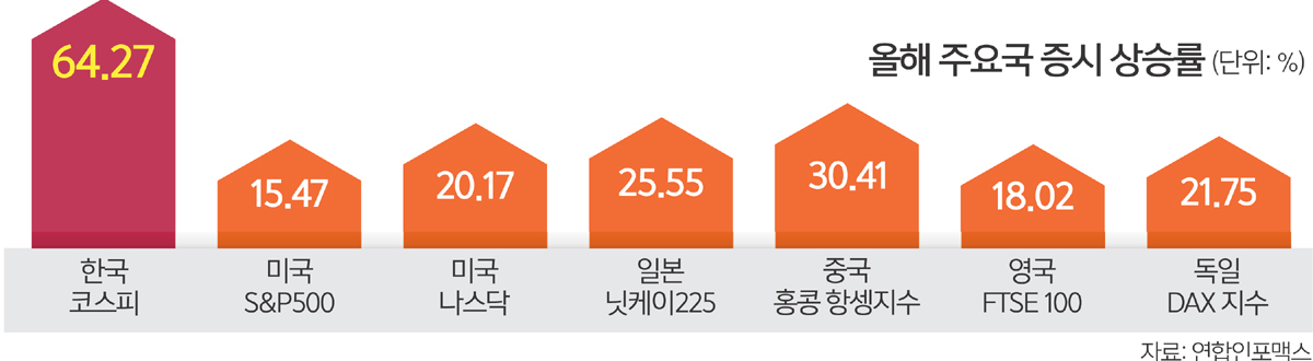 이런 대내외적인 요인에 힘입어 올해 코스피 상승률은 주요 국가 지수 중에서도 가장 가파른 것으로 나타났다. 코스피는 연초 대비 64.27%가 급등했다. 같은 기간 일본 닛케이225(25.9%)나 홍콩 항셍지수(30.41%), 영국 FTSE 100(18.02%), 독일 DAX(21.75) 지수를 압도했다. 연일 최고가를 경신한 미국 S&P500(15.47%)이나 미국 나스닥(20.17%)은 상대적으로 상승률이 저조했다. 코스피가 글로벌 증시 상승 흐름을 따라가면서도 한국 증시의 재평가가 이뤄졌기 때문이라는 평가가 나온다.