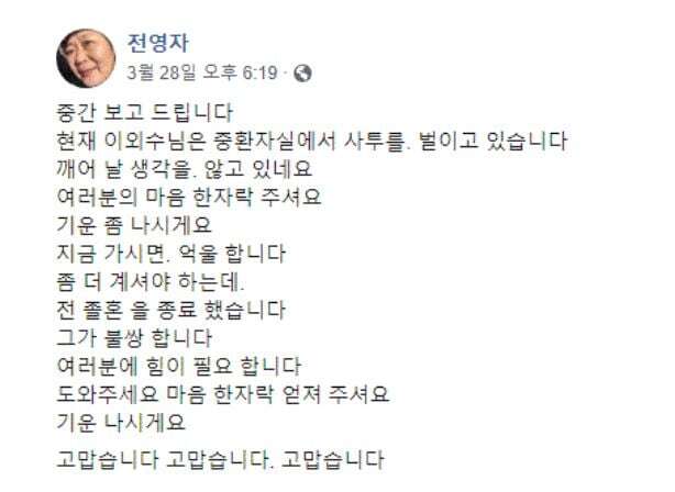 그러나 2020년 3월 이씨가 뇌출혈로 쓰러져 병원에서 입원 치료를 받자, “그가 불쌍하다”며 졸혼 종료를 선언하고 남편 곁을 지키며 병간호했다. 이씨가 2022년 세상을 떠나기 전까지 그의 곁을 지켰으며, 이후에는 춘천에서 혼자 생활한 것으로 알려졌다.