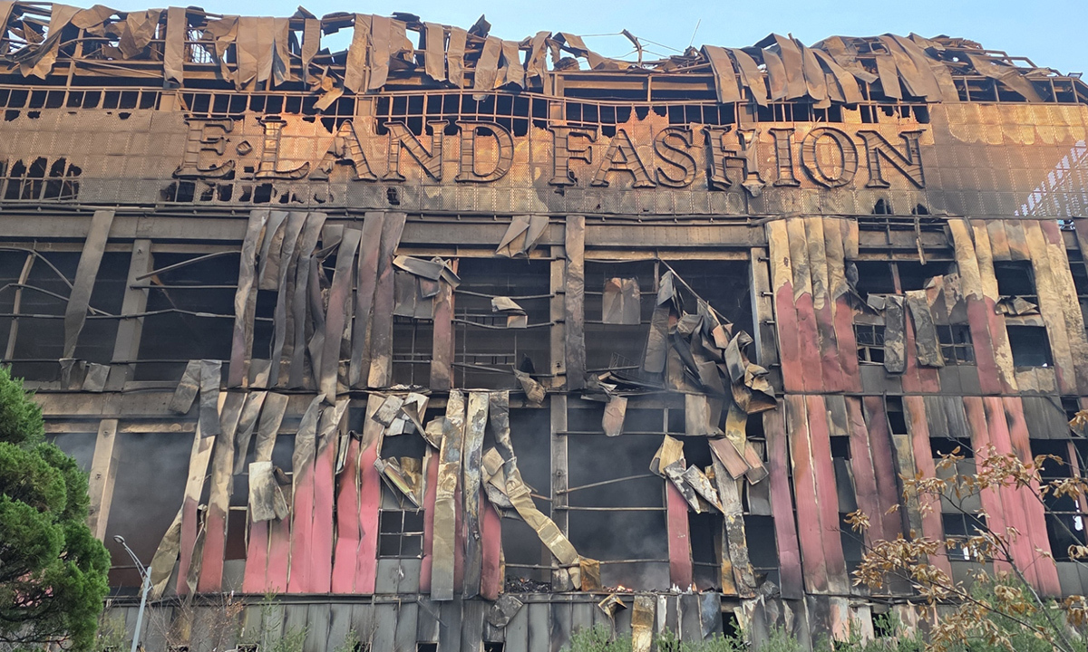 이랜드 물류창고 화재 이틀 째인 16일 충남 천안 동남구 이랜드패션 물류센터 창고가 날이 밝으면서 화재 흔적이 고스란히 드러났다.