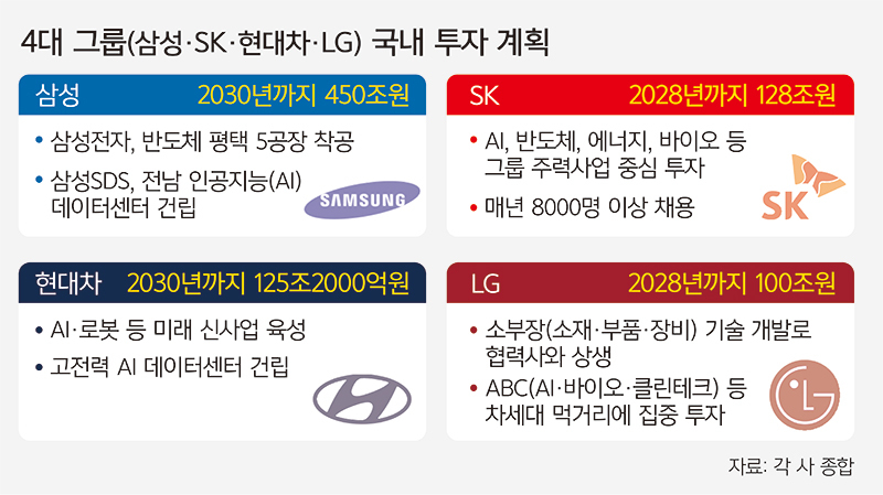 4대 그룹은 16일 이재명 대통령 주재로 열린 한·미 ‘조인트 팩트시트’(공동 설명자료) 후속 논의 민간 합동회의가 끝난 직후 각각 대규모 국내 투자 및 고용 계획을 밝혔다. 삼성과 현대차가 2030년까지 각각 450조원과 125조2000억원을, SK와 LG가 2028년까지 각각 128조원과 100조원을 투입해 4대 그룹만 총 803조2000억원을 투입하게 된다. 회의에 참석한 한화, HD현대, 셀트리온의 국내 투자분까지 합치면 총액은 830조원으로 늘어난다.