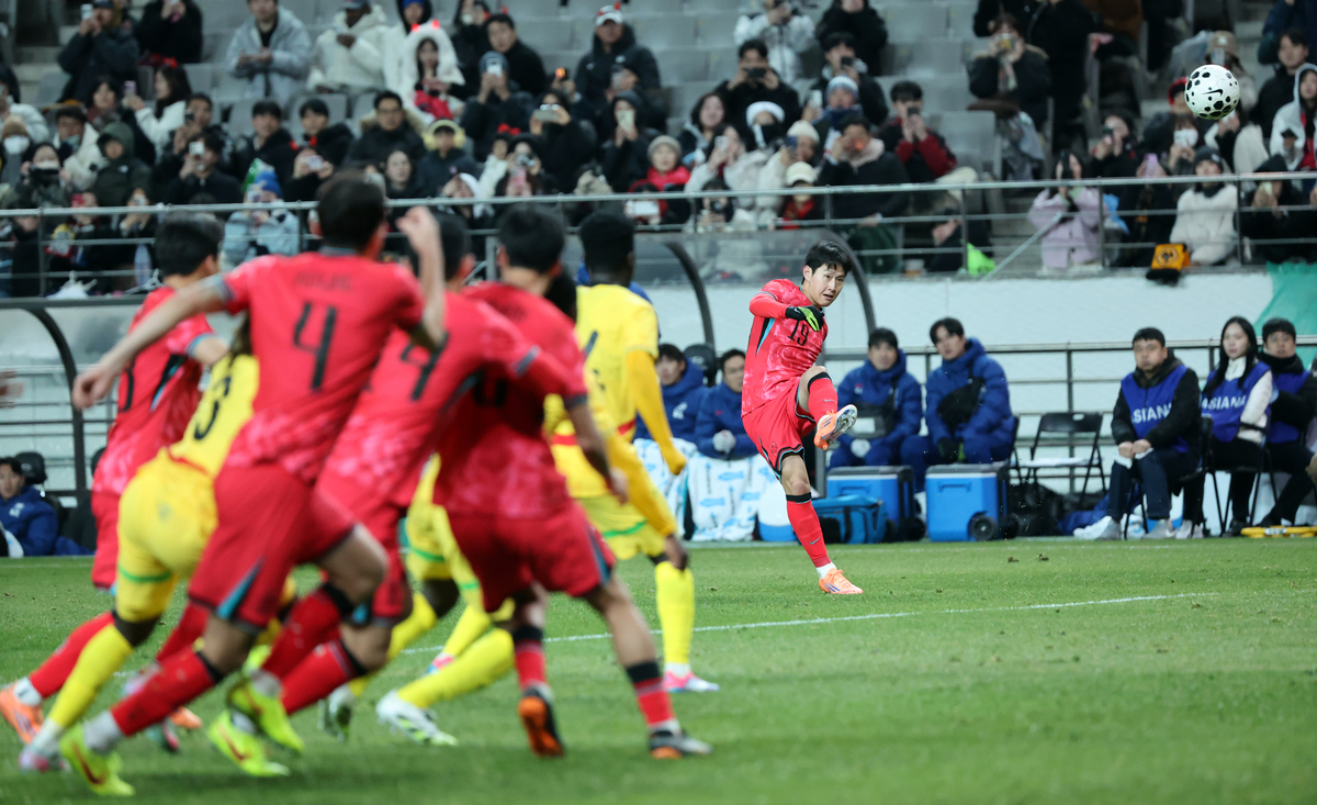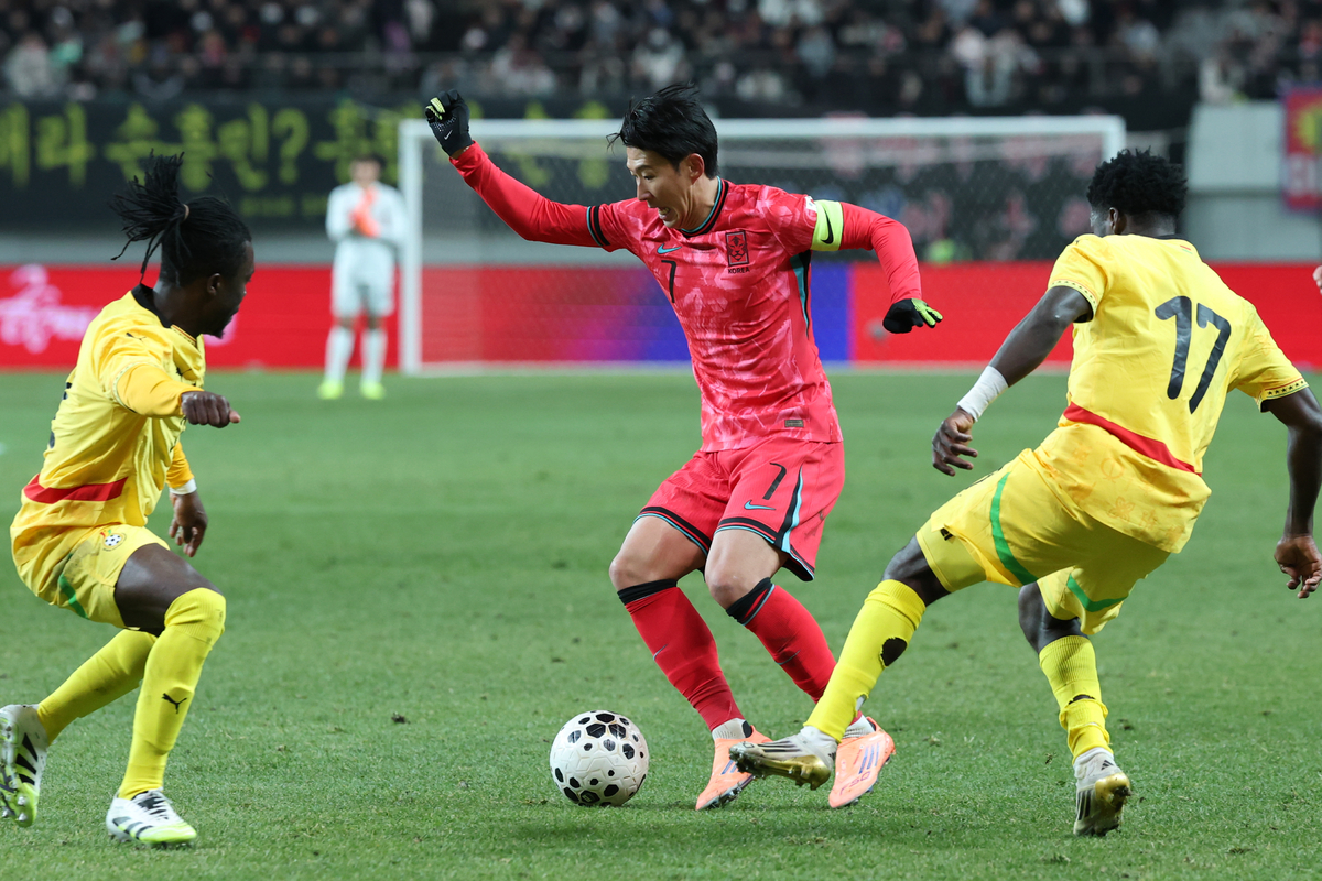 얼어붙은 팬심을 녹이기 위해선 대표팀의 화끈한 골 폭죽이 필요했지만, 대다수 바뀐 멤버 때문이었을까. 지난 14일 대전에서 열렸던 볼리비아전처럼 이날도 한국의 경기력은 답답함 그 자체였다. 가나의 국제축구연맹(FIFA) 랭킹이 73위로 한국(22위)보다 51계단이 낮았지만, 한국은 가나의 수비진을 좀처럼 뚫어내지 못했다. 수비진에서 공을 이리저리 돌리다 전방에 롱패스를 하는 단조로운 공격 패턴으로 일관했다. 빌드업 과정이 투박했던 결과, 전반 중후반까지 유효 슈팅도 1개 날리지 못했다. 전반 41분 손흥민이 올린 왼쪽 코너킥을 권혁규가 방향만 바꾸는 헤더로 연결한 게 유일한 유효슈팅이었다.