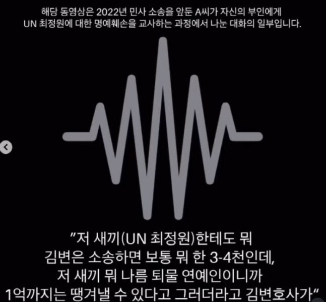 이와 함께 그는 A씨의 음성이 담긴 녹취 일부도 공개하며 “2022년 민사 소송을 앞두고 A씨가 아내에게 자신에 대한 명예훼손을 교사하는 과정에서 나눈 대화의 일부”라고 주장했다. 공개된 녹취록에는 A씨가 “저 XX한테도 소송하면 보통 3~4000만원인데, 저 XX 나름 퇴물 연예인이니까 1억까지는 땡겨낼 수 있다고 그러더라고, 변호사가”라고 말하는 내용이 담겨 있어 충격을 주고 있다.