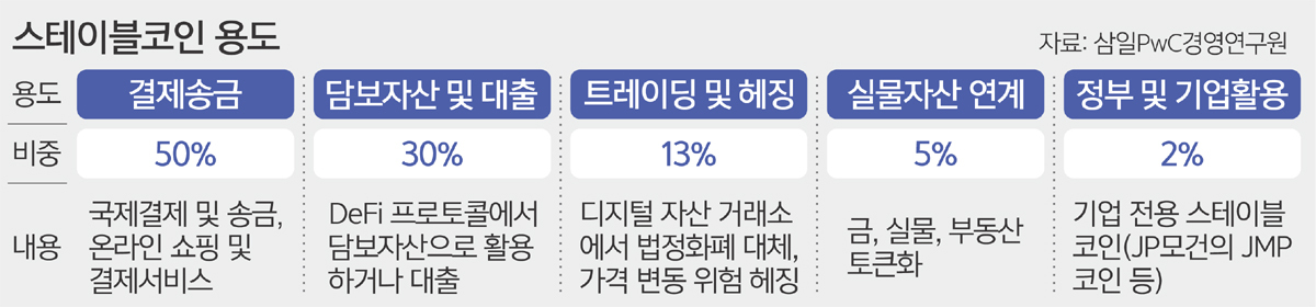 삼일PwC경영연구원에 따르면 스테이블 코인은 온라인 쇼핑 등 결제서비스와 담보자산 및 대출에서 80%가 활용될 것으로 예측되는 등 전통 금융시장의 활용처를 위협할 것으로 전망된다.