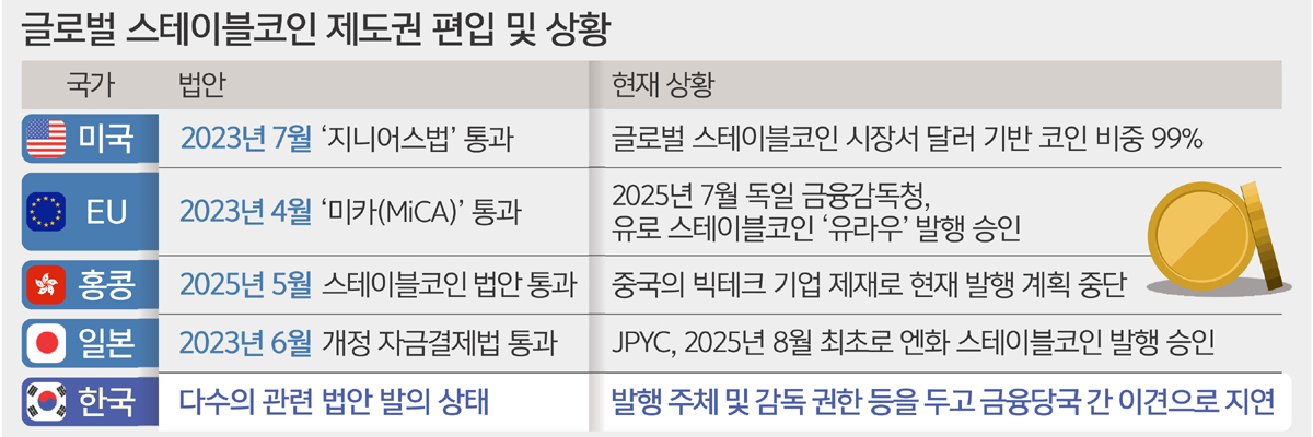윤 이사의 말처럼 지난 7월 스테이블코인 기본법인 지니어스 법안이 통과된 미국의 경우 지난해 달러에 연동된 스테이블코인의 연간 송금액만 총 27조6000억달러에 육박한다. 이미 글로벌 신용카드사인 비자와 마스터카드의 연간 거래량을 넘어선 수치다.