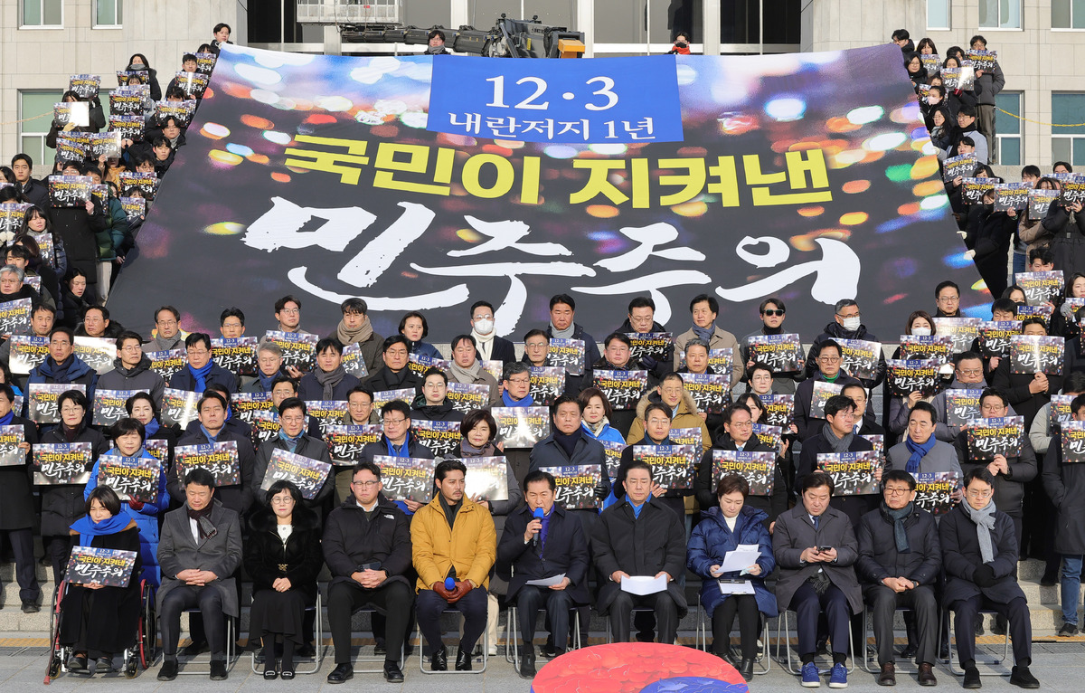민주당은 이날 국회 본청 앞 계단에서 12·3 내란 저지 1년 현장최고위원회의를 열었다. 민주당 정청래 대표는 “12월3일 그날 밤, 시민들은 두려워하지 않고 국회로 모여 계엄군 헬기 굉음을 똑똑이 들었고 무장한 계엄군 군홧발을 봤다”며 “시민이 비상계엄을 온몸으로 막아냈다”고 말했다. 그러면서 윤석열 전 대통령 파면을 “헌법의 적을 헌법으로 물리친 것”이라며 “우리 모두는 어깨를 걸고 대한민국을 지켜낸 전우이자 동지”라고 밝혔다.