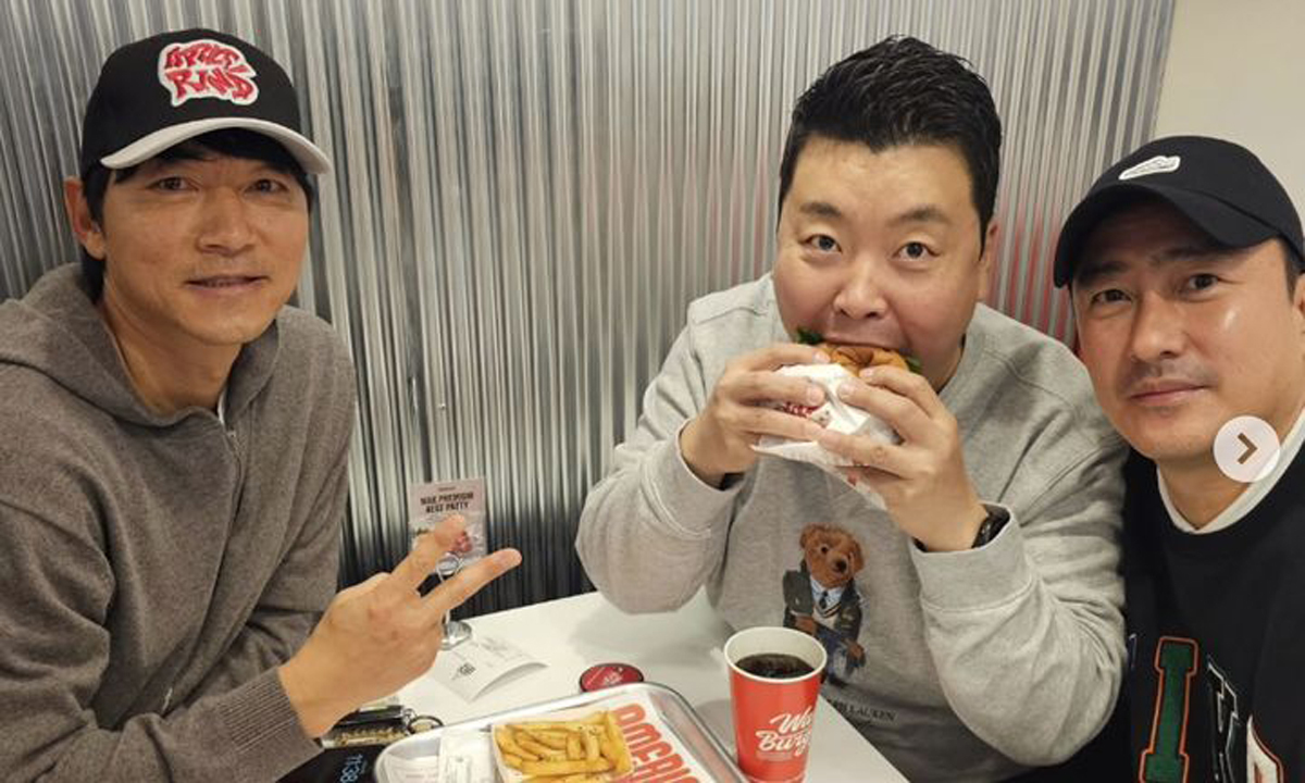 사진 속 김남일은 브이 포즈를 취하고 있고, 정호영은 햄버거를 한입 베어먹는 모습을 보였다.