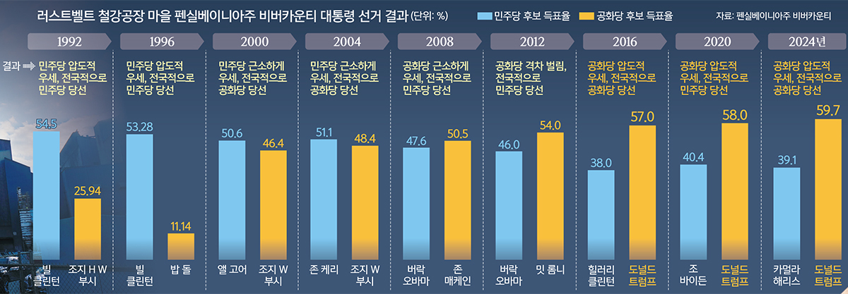 강력한 노조 문화를 바탕으로 민주당을 지지했던 피츠버그 근교 비버 카운티, 워싱턴 카운티 등은 지난 대선에서 모두 도널드 트럼프 대통령의 손을 들어줬다. 도시 피츠버그가 포함된 앨리게니 카운티에선 카멀라 해리스 민주당 후보의 표가 좀 더 나왔지만, 앨리게니 카운티에서도 브래드독 같은 근교로 나오면 트럼프 대통령에 열광하는 지지자가 많았다. 전형적인 미국 ‘러스트벨트’ 마을의 우경화 이야기가 이 지역에 있다. 이 지역의 사람들은 쇠퇴한 지역 경제로 인한 상실감, 예전의 번영에 대한 향수, ‘엘리트’에 대한 분노를 말했다. 이는 ‘미국을 다시 위대하게’를 내건 트럼프 대통령에 대한 기대로 연결된다.