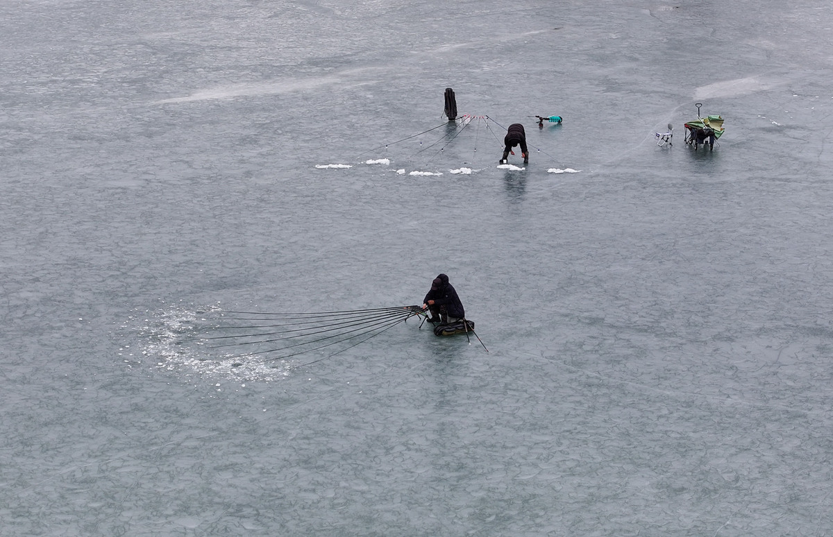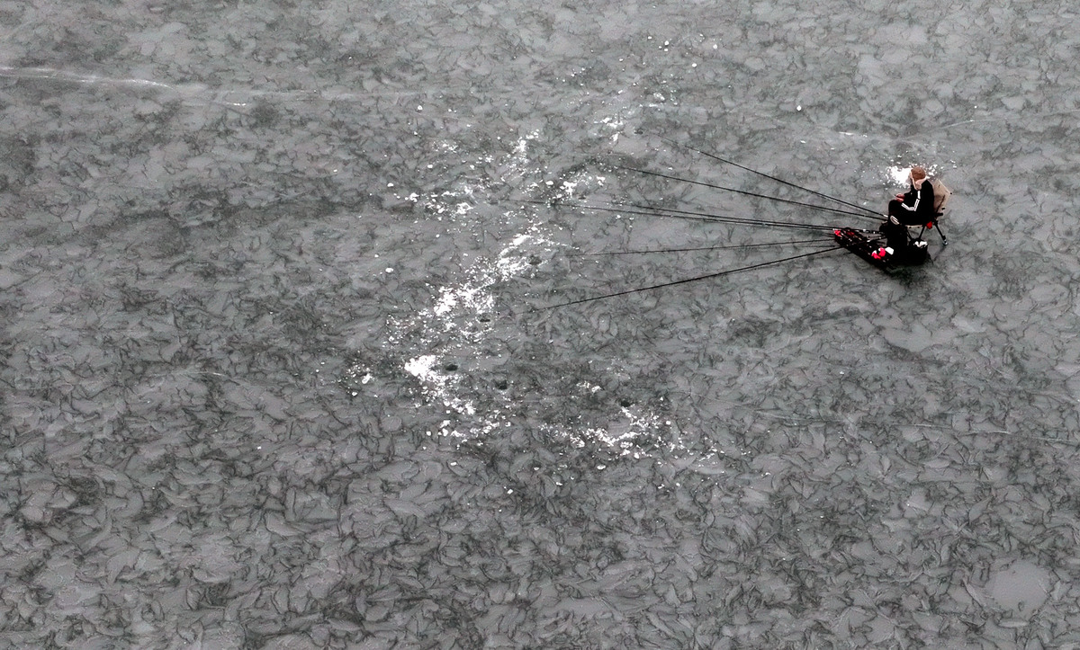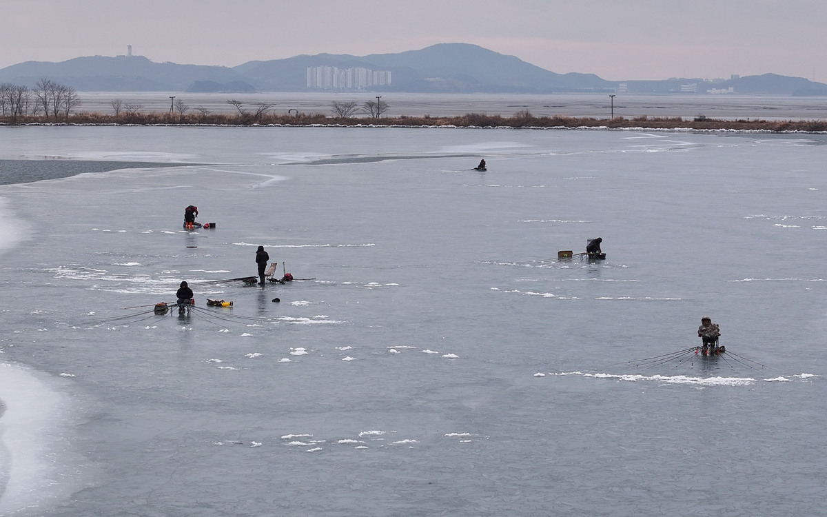 인천 강화군 화도면 분오리저수지가 최근 한파로 결빙되면서 낚시객들이 얼음 위에 구멍을 뚫고 빙어와 붕어 낚시를 즐기고 있다.