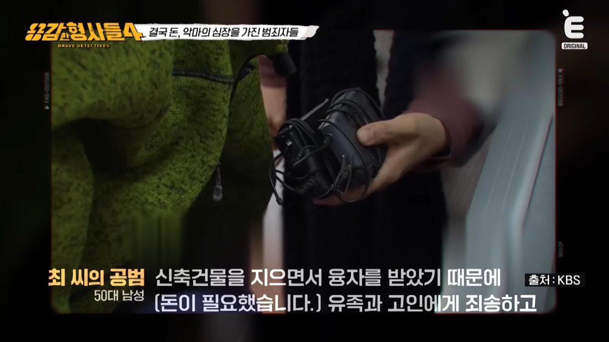 지난 9일 방송된 티캐스트 E채널 ‘용감한 형사들4’에서는 광주동부경찰서 형사과 신준우 경위와 과학수사대(KCSI) 윤외출 전 경무관, 김진수 경감이 출연해 수사 일지를 공개했다.