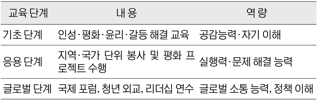 최근 가장 주목받는 사업은 ‘10만 청년 평화 리더 양성 프로젝트’다. 이 프로그램은 단순 참여형 캠페인이 아니라, 단계별 교육 시스템을 갖춘 것이 특징이다.