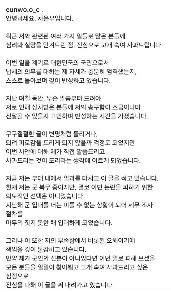 차은우는 “이번 일을 계기로 대한민국의 국민으로서 납세의 의무를 대하는 제 자세가 충분히 엄격했는지 스스로 돌아보며 깊이 반성하고 있다”며 “지난 며칠 동안 무슨 말씀부터 드려야 저로 인해 상처받은 분들께 저의 송구함이 조금이나마 전달될 수 있을지 고민하며 반성하는 시간을 가졌다”고 적었다.