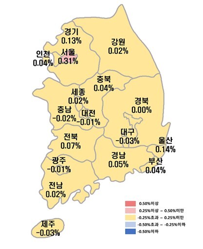 경기도는 지난주와 마찬가지로 0.13% 상승한 가운데 성남 분당구(0.40%)와 과천시(0.25%)는 지난주보다 오름폭이 둔화했다.