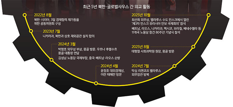 북한은 코로나19 팬데믹 종료 이후 글로벌사우스와의 교류를 크게 확대했고 비동맹운동정상회의, 개발도상국정상회의, 브릭스 회의 등에 참여했다. 북한·글로벌사우스 교류에 큰 역할을 하는 게 러시아다. 러시아를 매개로 벨라루스, 우즈베키스탄 등 독립국가연합(CIS) 소속 국가와의 외교에 적극 나섰다. 2024년 11월 통일연구원 발표 자료에 따르면 북한의 글로벌사우스 외교 17회 중 6회가 러시아에서 이루어졌다. 회원국이 아님에도 브릭스에 북한이 참여한 데는 러시아의 주선 혹은 지원이 중요한 역할을 했을 것으로 보인다.