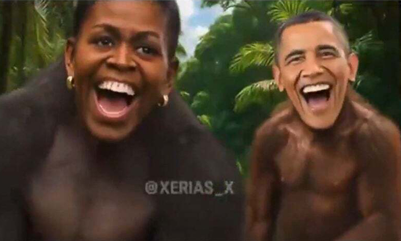 도널드 트럼프 미국 대통령이 지난 5일 SNS에 게시했다가 12시간 만에 삭제한 버락 오바마 전 대통령(오른쪽) 부부 조롱 영상의 한 장면. 오바마와 부인 미셸 여사의 얼굴을 원숭이에 합성했다. SNS 캡처