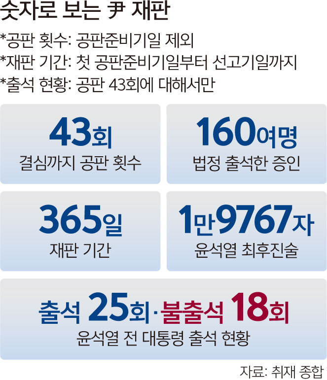 윤 전 대통령의 내란 재판 선고는 지난해 2월20일 첫 공판준비기일부터 이날까지 꼭 1년365일이 걸렸다. 12·3 비상계엄 선포부터는 443일 만이다.