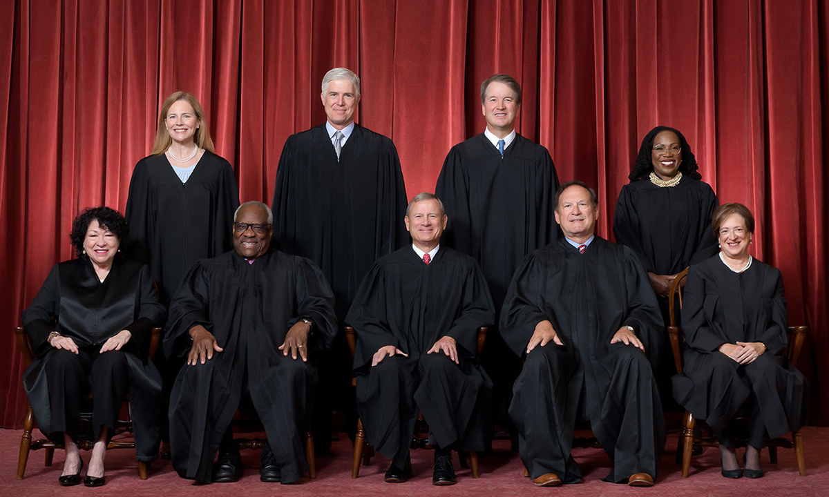 미국 연방대법원 대법관 9인. 앞줄 왼쪽부터 소니아 소토마요르, 클래런스 토머스, 존 로버츠(대법원장), 새뮤얼 알리토, 엘레나 케이건. 뒷줄 왼쪽부터 에이미 코니 배럿, 닐 고서치, 브렛 캐버노, 커탄지 브라운 잭슨. 미 연방대법원 홈페이지