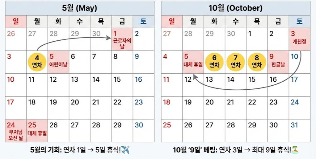 10월 역시 개천절 대체공휴일과 한글날 사이 평일에 연차를 배치하면 9일 안팎의 연휴를 만들 수 있다.