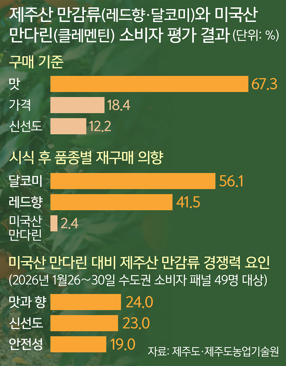 제주도농업기술원이 1월 26일부터 30일까지 닷새간 수도권 소비자 49명을 대상으로 제주산 만감류 2품종(달코미·레드향)과 미국산 만다린 1품종(클레멘틴)을 비교 평가한 결과 제주산 만감류가 맛과 향, 재구매 의향 등 전반적인 항목에서 우수한 평가를 받았다.