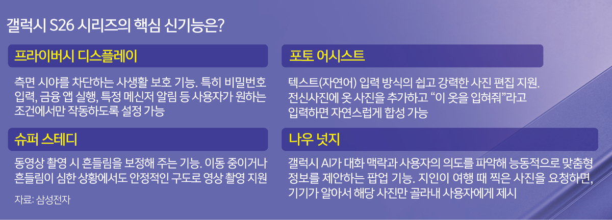 25일(현지시간) 미국 샌프란시스코의 대표 랜드마크인 ‘팰리스 오브 파인 아트’. 삼성전자의 새로운 플래그십 폰 ‘갤럭시 S26 시리즈’가 공개된 갤럭시 언팩 2026 현장은 열광의 연속이었다. 안개가 낀 흐린 날씨에도 1200명 이상의 미디어, 인플루언서, 비즈니스 파트너들이 참여해 S26 시리즈의 새로운 기능이 시연될 때마다 환호성을 질렀다. 특히 아래 두 가지 기능은 이번 언팩의 하이라이트로 꼽혔다.