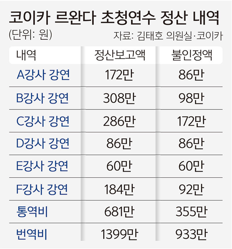 30일 국회 외교통일위원회 김태호 의원이 코이카로 부터 제출 받은 지난해 ‘르완다 전파 및 사이버보안 관리 시스템 활용 역량강화’ 초청연수 관련 정산 내역에 따르면 B업체는 A교수를 비롯해 총 6명의 강사료를 부풀린 것으로 나타났다. 두 명의 강사 명의로는 강연을 한 차례도 진행하지 않았지만 강사료 명목으로 예산을 챙겼다. 나머지는 한 차례 강연한 것을 빌미로 두 차례 강연료로 부풀려 받았다. 실제 하지 않은 강연료 예산 총 594만원이 부정 수급됐다.