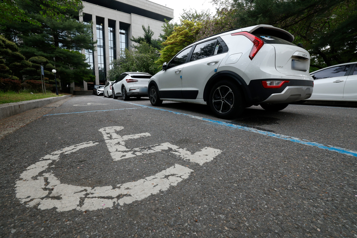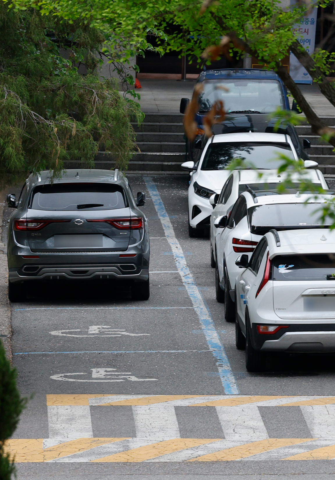 제46회 장애인의 날인 20일 서울 영등포구 국회도서관 옆 장애인 전용 주차구역 인근에 불법 주차 차량이 줄지어 서 있다.