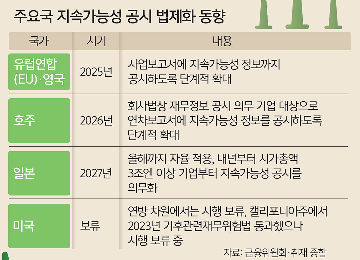 금융위는 국민연금 요구대로 내년부터 지속가능성 공시를 도입하기는 물리적으로 어렵다는 입장이다. 그러나 단기 실적보다 초장기 투자를 실시하며 기업 존속과 시장 전체 안정성이 중요한 연기금이 기후·노동·공급망 같은 비재무 리스크를 비교할 수 있어야 한다고 요구하는 모습은 전 세계적으로 공통된다. 세계 최대 연기금인 노르웨이 국부펀드는 지분을 보유한 전 세계 약 9000개 포트폴리오 기업에 생태계 훼손 같은 자연 리스크 관리 평가 기준을 공개하고 이를 충족하지 않을 경우 투자 배제 가능성을 검토한다고 밝힌 바 있다.