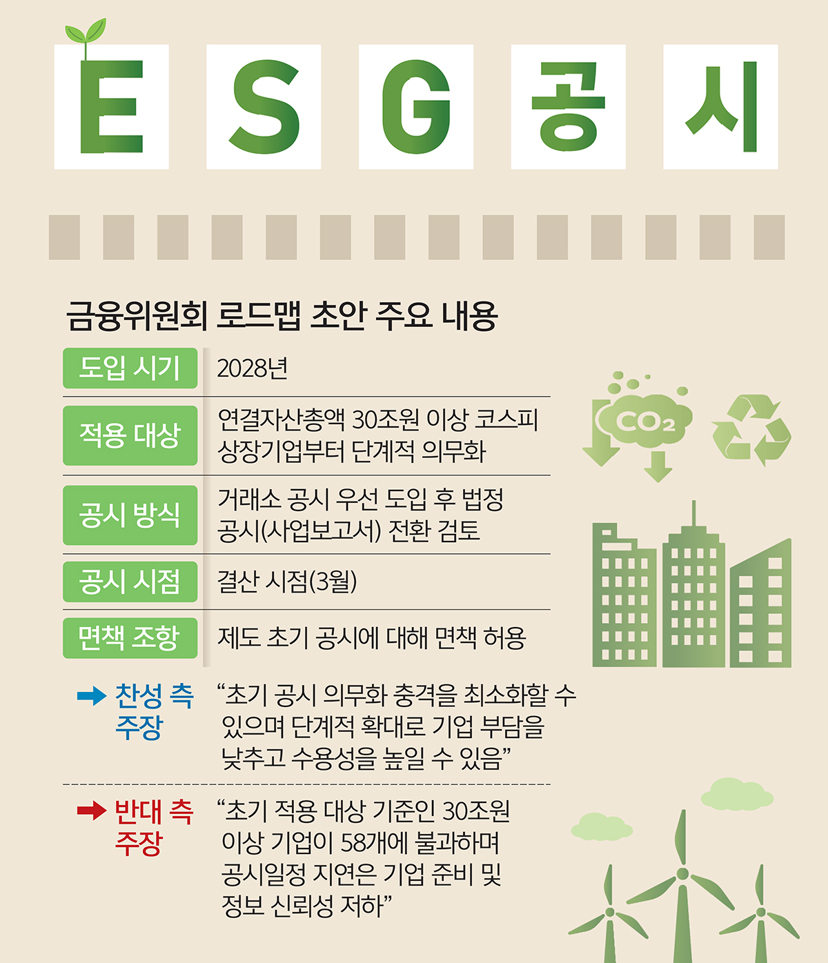 국내 지속가능성 공시제도 도입을 앞두고 가장 적극적으로 목소리를 내는 기관은 국민연금이다. 금융위 초안은 2028년(2027회계연도)부터 연결재무제표상 자산 30조원 이상 기업부터 비재무지표를 적용한 이후 적용대상을 단계적으로 넓히는 내용을 담고 있다. 이 초안대로면 첫해 공시 대상은 58개 기업에 그친다.
