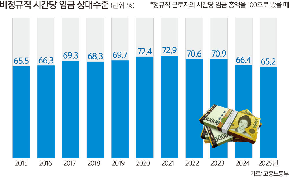 정규직 대비 비정규직 임금 수준은 통계를 산출하기 시작한 2008년 55.5%에서 점차 상승해 2021년 72.9%로 최고 수준을 찍었다. 이후 2022년 70.6%를 기록한 뒤 2024년과 지난해 전년 대비 4.5%포인트, 1.3%포인트 각각 하락했다. 그 결과 지난해 정규직이 100만원 벌 때 비정규직은 65만2000원을 버는 것으로 나타났다.