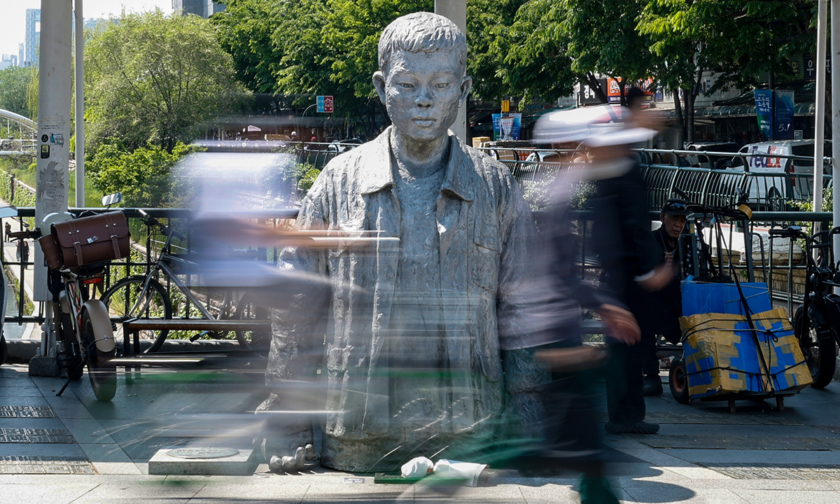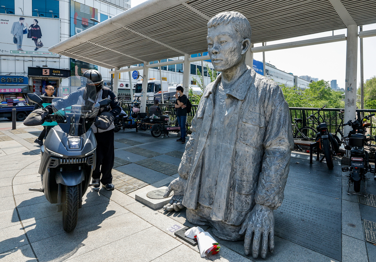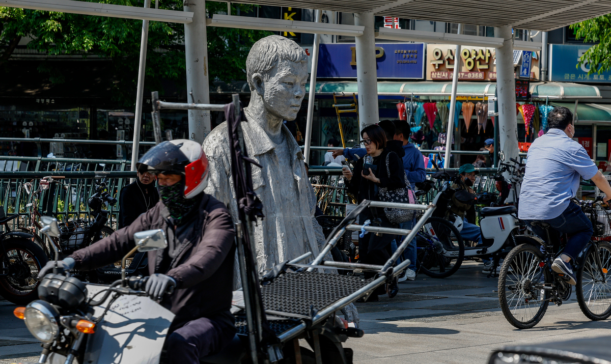 동상 곁으로는 길쭉한 원단을 어깨에 짊어진 상인과 자기 몸보다 큰 짐을 실은 오토바이가 분주히 오갔다. 청계천 물길 위로 초여름 햇살이 내려앉은 이날 노동자들은 부지런히 움직이고 땀 흘리며 저마다 삶을 지탱하고 있었다.
